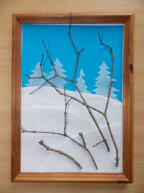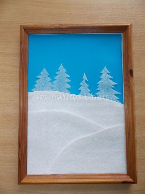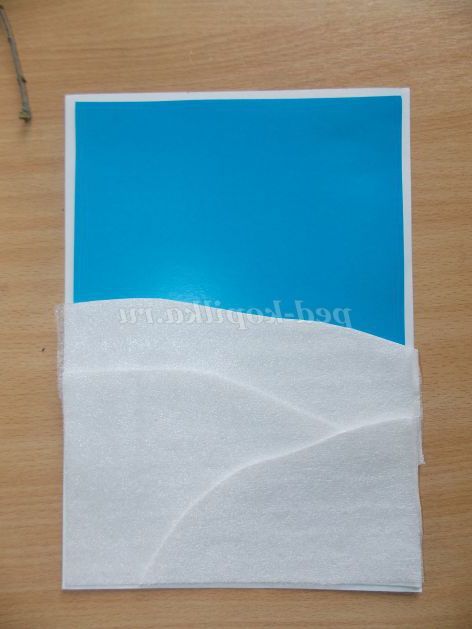З пінополіетилену, який залишається від упаковки різних товарів вирізаємо засніжені пагорби довільної форми (залежно від розмірів наявних шматків). Його можна замінити синтепоном або ватою. Приклеюємо пагорби на основі. Починаємо приклеювати від горизонту, тобто від середини аркуша до низу картини. Головне - не допускати просвітів фону.