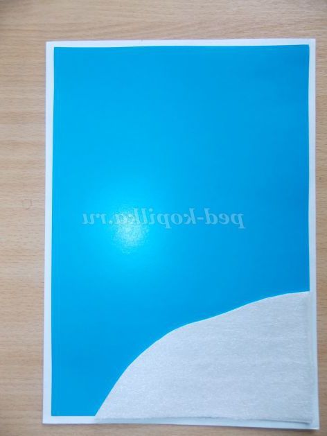 Спочатку приготуємо основу для нашої композиції! Візьмемо картон синього або блакитного кольору. Якщо немає картону, можна виконати малюнок зимового неба фарбами на білому папері або обтягнути підкладку тканиною, але це буде більш трудомістко.