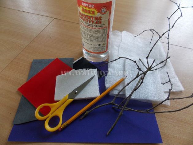 Приступаємо до виготовлення снігурів. Для цього можна використовувати оксамитову папір або шматочки тканини, наприклад велюру або оксамиту, тільки їх необхідно попередньо приклеїти до паперу і висушити.