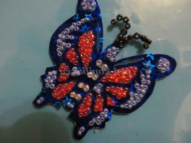 Приклеюємо метелики до скла. Порожнечі в крильцях також засипаємо бісером. Задній фон клею блакитний фолія.