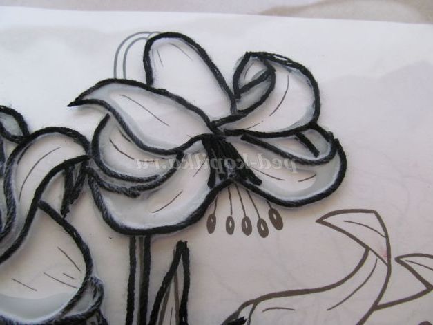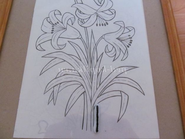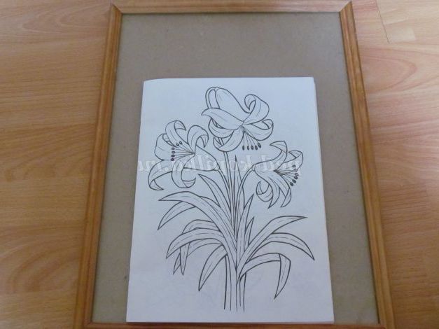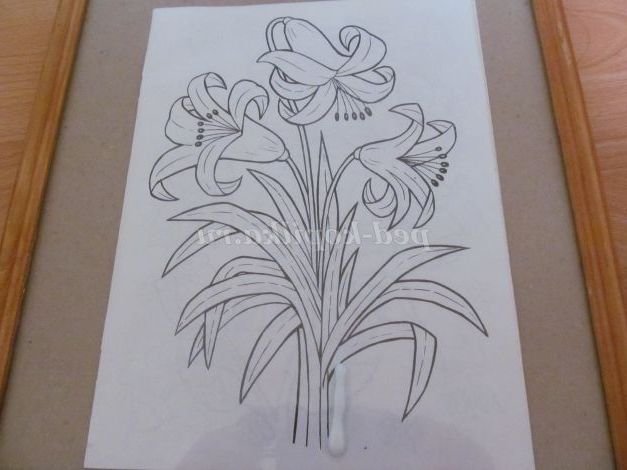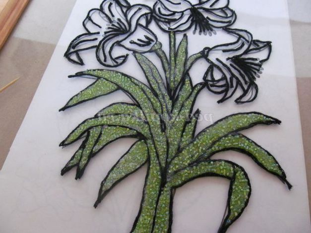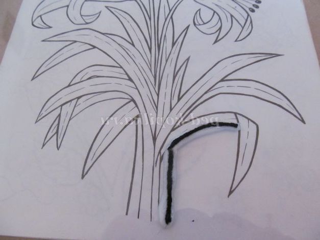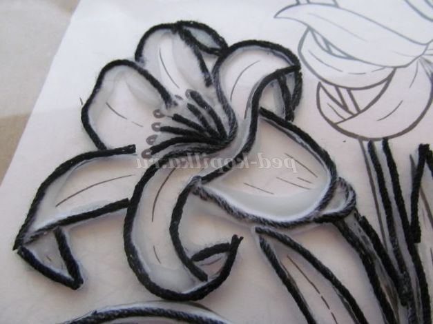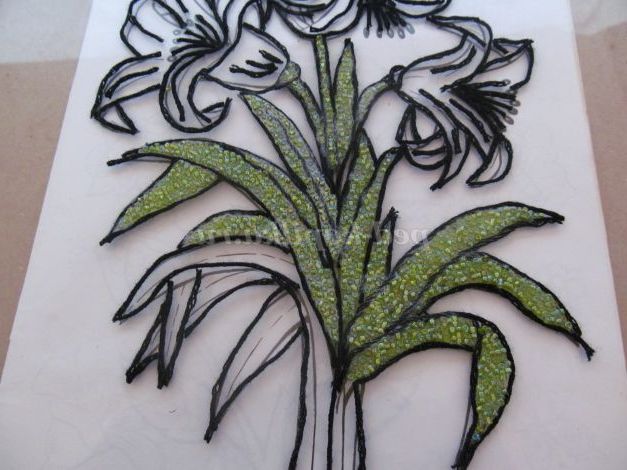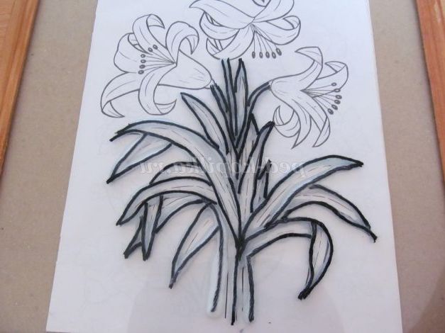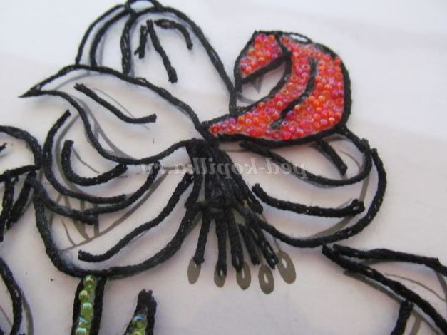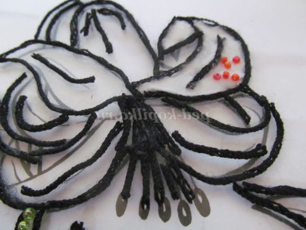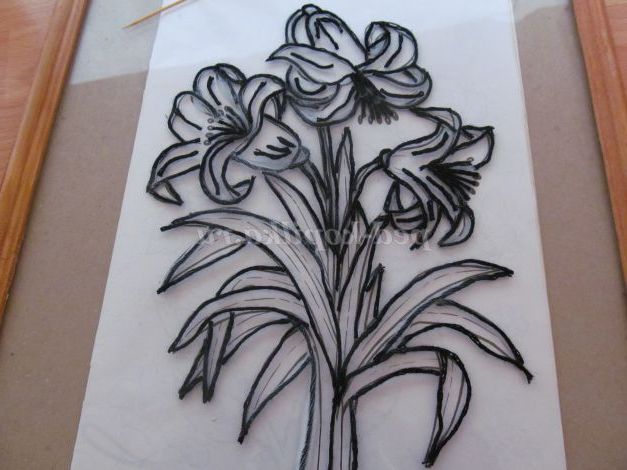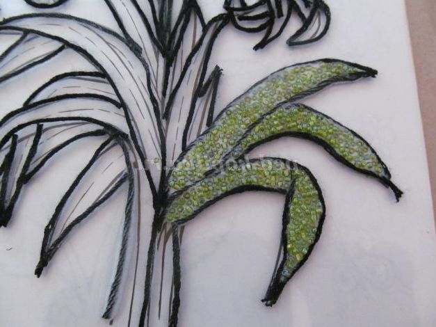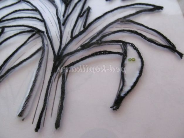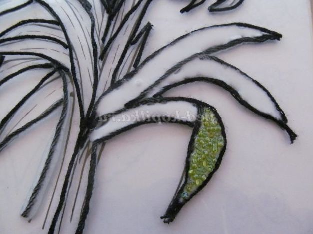 1. Малюнок ложем під скло. Контур малюнка обводимо клеєм і зверху ложем шматочок пряжі.