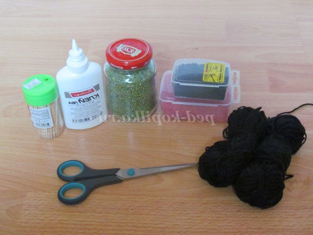 Рамка для фотографий.Клей ПВА. Ножницы.Пряжа чорного кольору. Бісер зеленого, червоного і чорного цвета.Зубочистка.