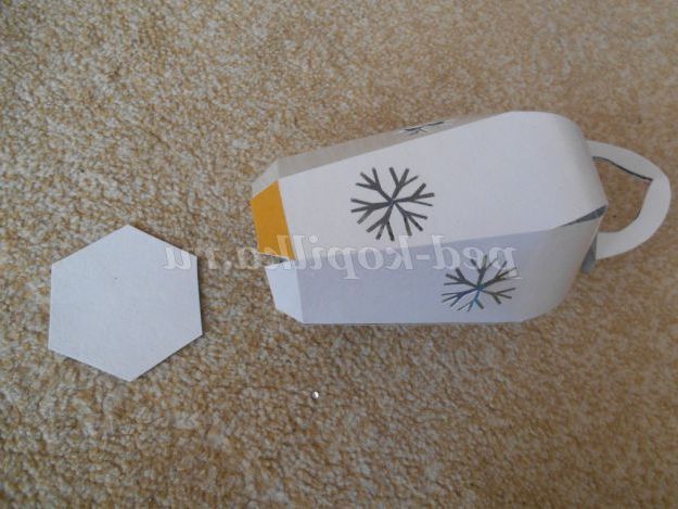 До однієї грані ліхтарика приклеюємо шестикутник на двосторонній скотч. До протилежної грані зсередини приклеюємо смужку толстого двостороннього скотчу.