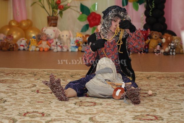 Намагається запросити з собою дітей: пропонує їм чарівну цукерку, покататися на мітлі. Діти відмовляються, Баба Яга прощається з ними і відлітає до інших дітей, в інший дитячий сад.