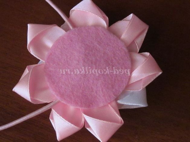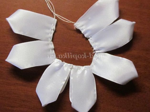 6. Всі 7 пелюсток з'єднуємо, стягаємо нитки і зав'язуємо. Далі з'єднуємо таким же способом 5 білих пелюсток та 5 рожевих пелюсток.