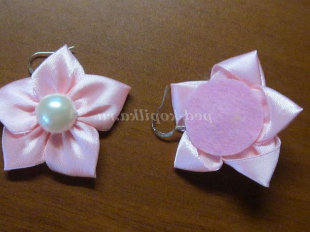 14. Для сережок нарізати рожеву стрічку на відрізки довжиною 5см -10 шт. Готові квіти пришити до заготівлі з допомогою ниток в два складання. На виворітну сторону квітки закріпити гурток фетру з допомогою клею момент, закриваючи нитки.