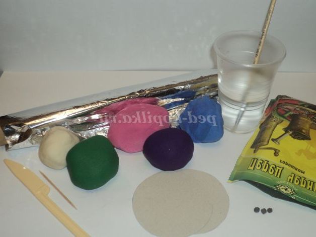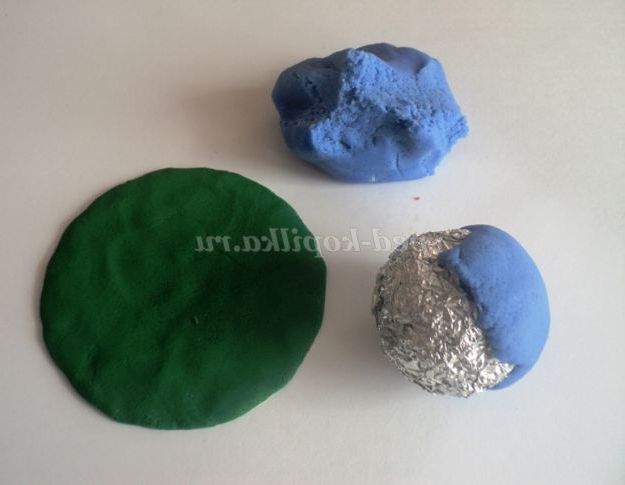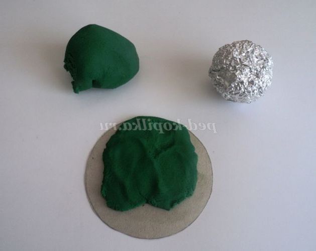 1. Гурток картону змочити водою і наліпити на нього зелене тісто - вийде полянка для нашого героя. З фольги скачати кулю близько 5 см в діаметрі.