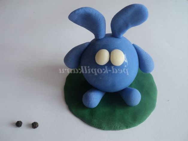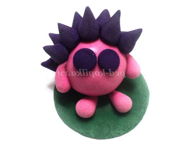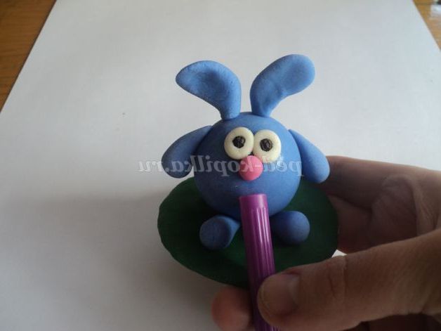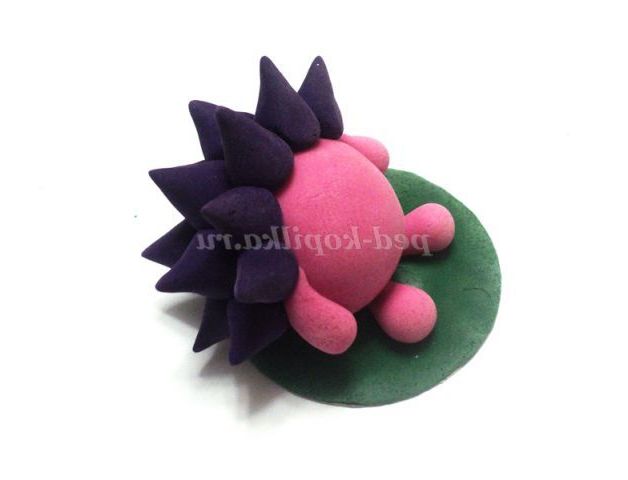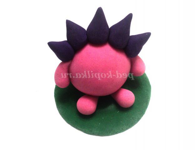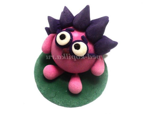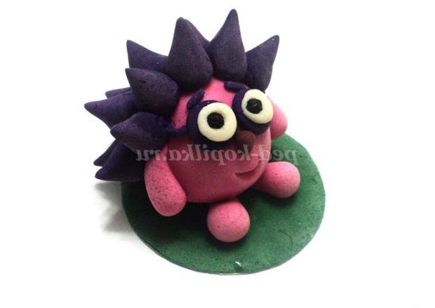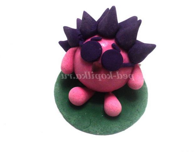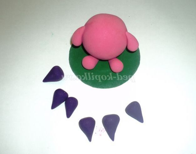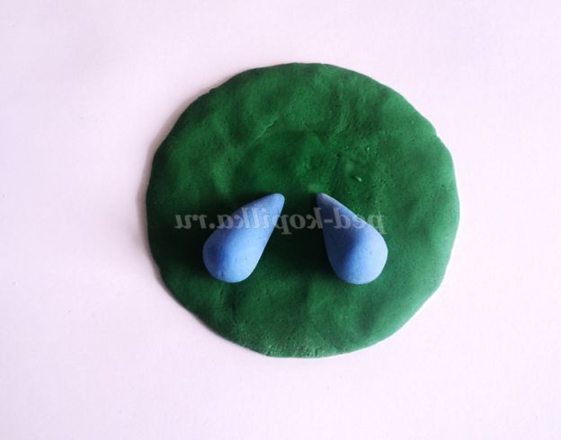 4. Зліпити дві кульки з фіолетового тіста, розплющити їх у коржі, приклеїти до лиця - це окуляри.