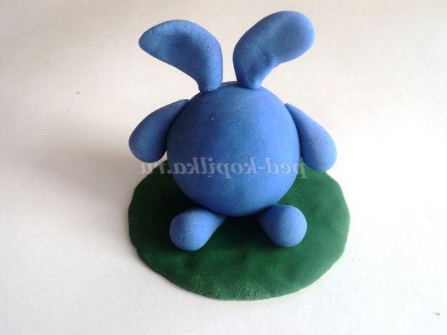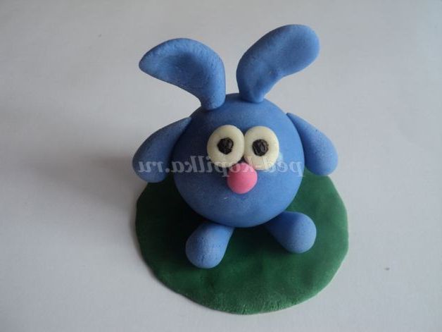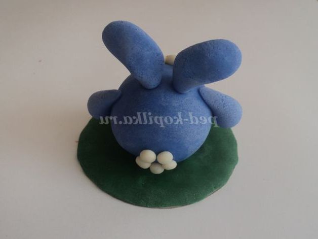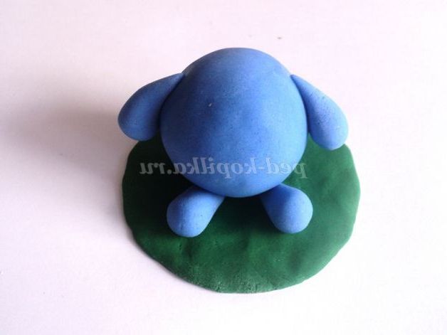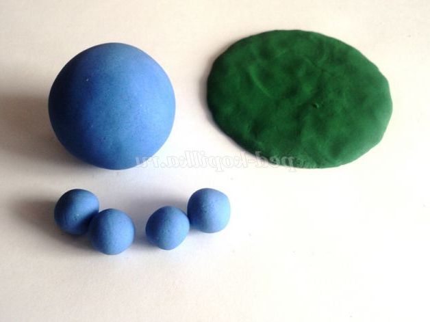 Кроша тісто пофарбовано у блакитний колір. Фарбувати тісто зручно гуашшю. В клубочку тіста зробіть поглиблення і покладіть туди фарбу потрібного кольору. Потім розминайте тісто до тих пір, поки воно не набуде рівномірний колір. Краще це робити в гумових рукавичках.