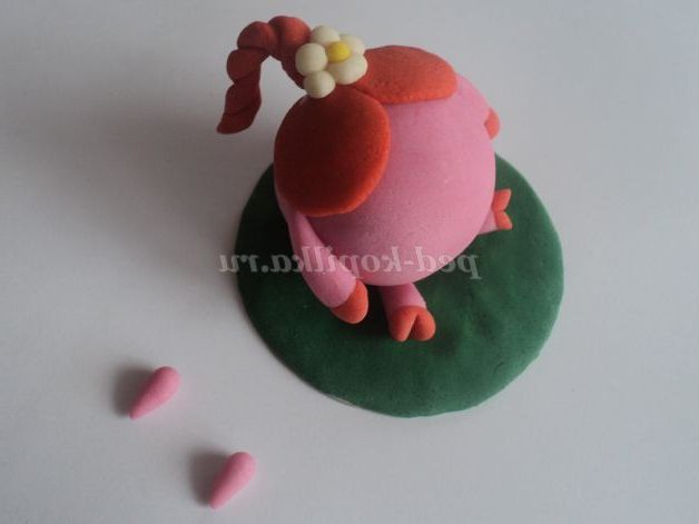 5. Додати тонкі ковбаски - дужки окулярів, брови. Для носика перемішати грудочку рожевого і зеленого кольору - вийде коричневий колір. Скачати маленька кулька, злегка сплющити його з одного боку і приклеїти до лиця.