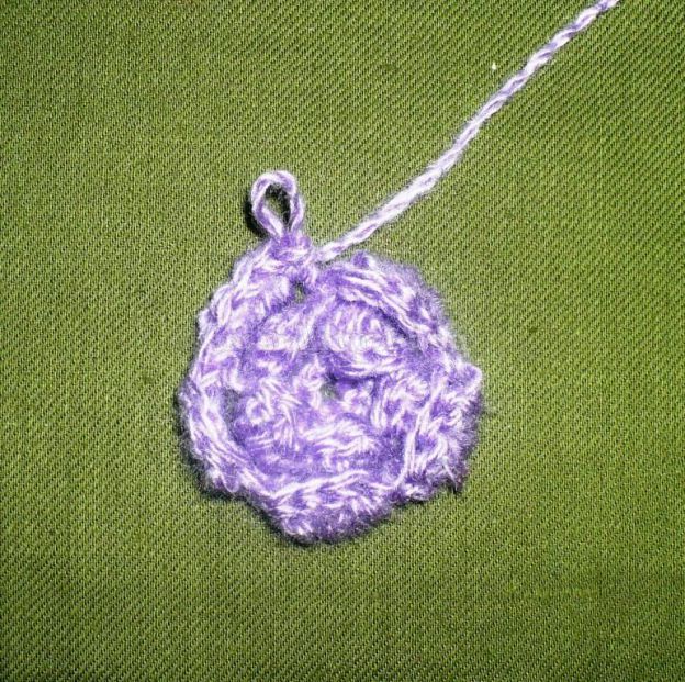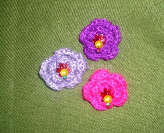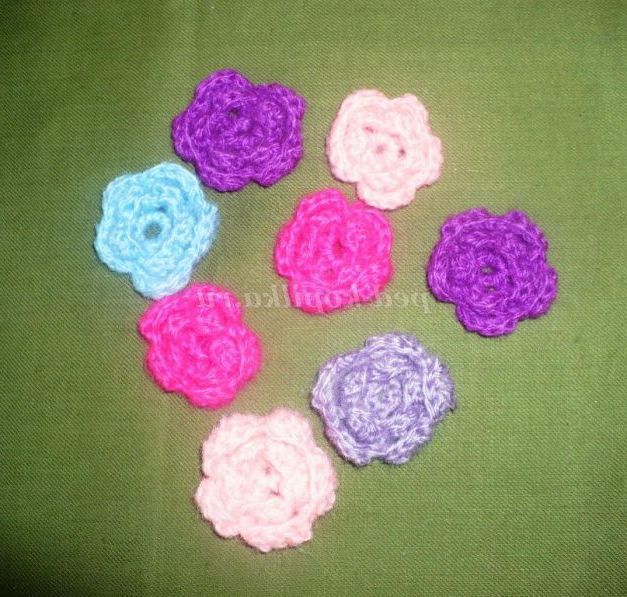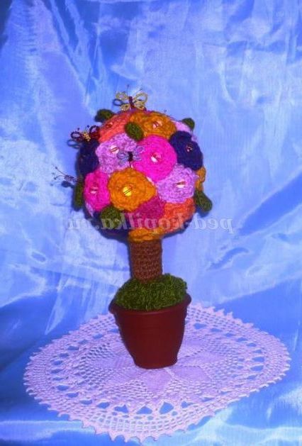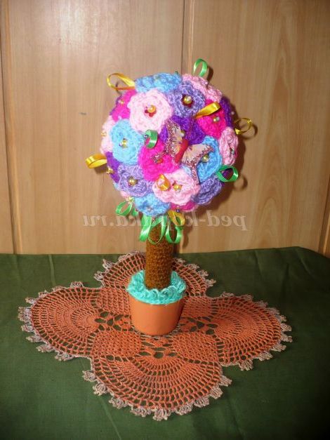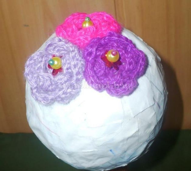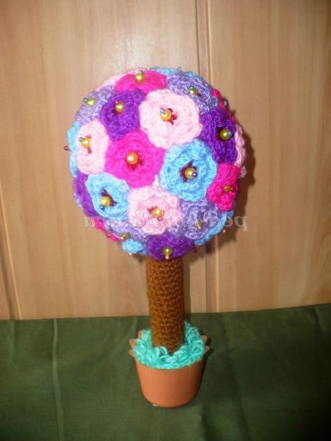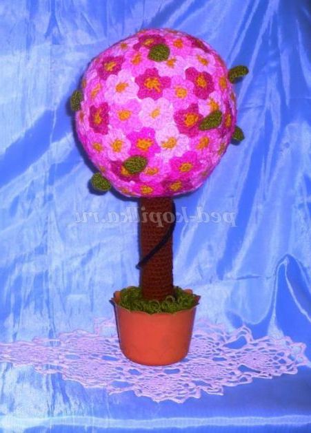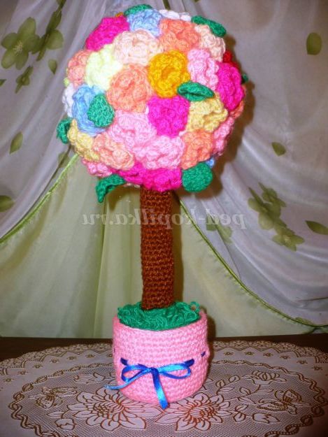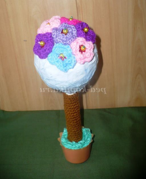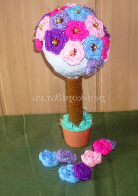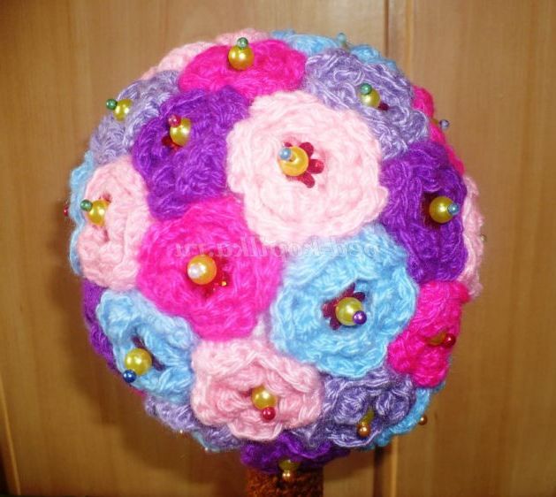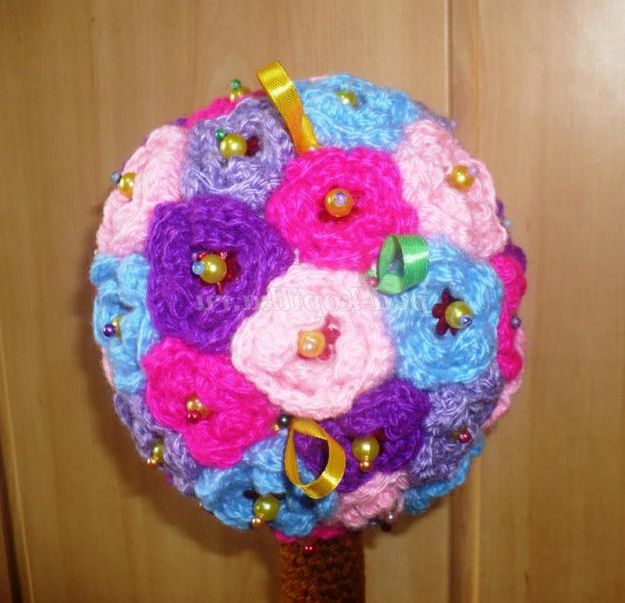 Декоруємо крону. Це самий приємний і цікавий момент. Ми будемо прикрашати крону в'язаними трояндами різних кольорів. В'яжемо трояндочки за схемою.
