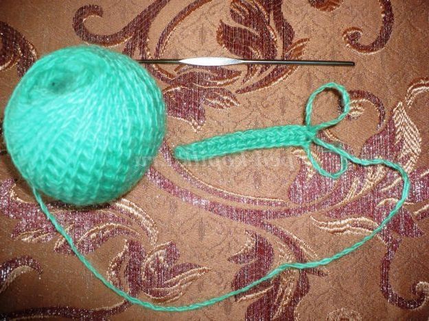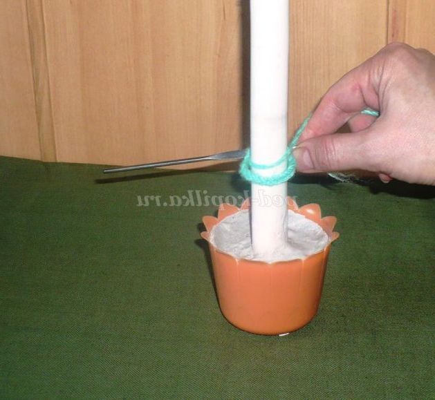 Декоруємо «землю» в горщику. Для цього набираємо зеленої пряжею ланцюжок з повітряних петель дорівнює обхвату стовбура.