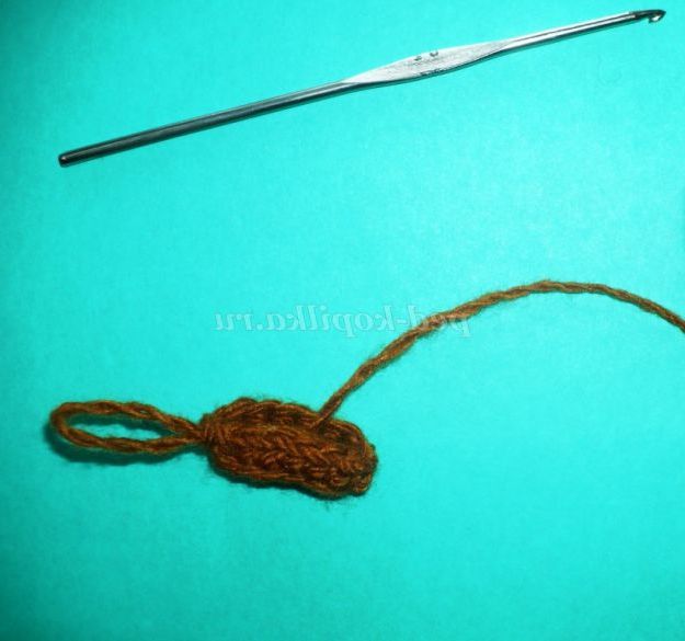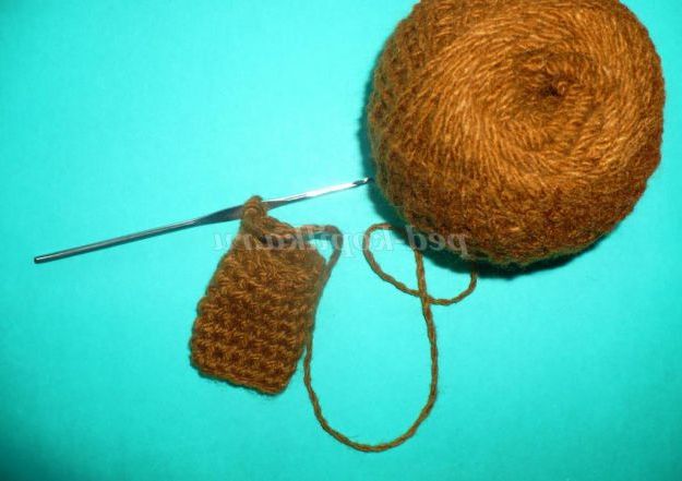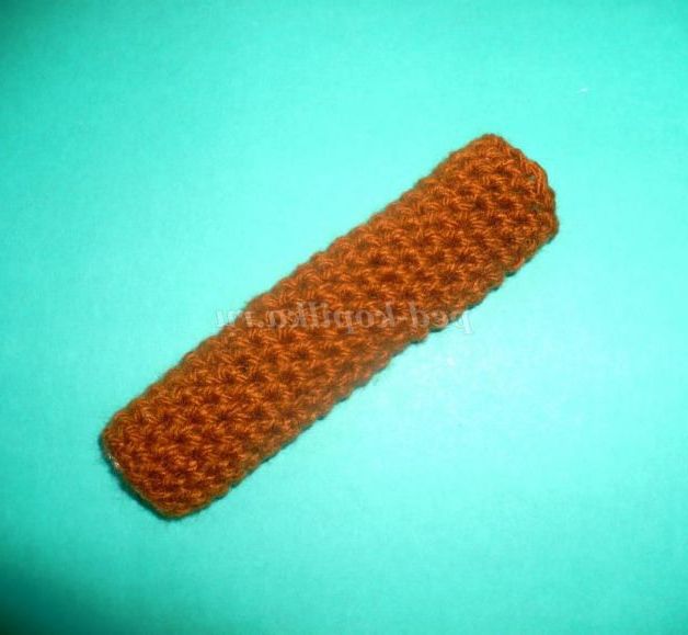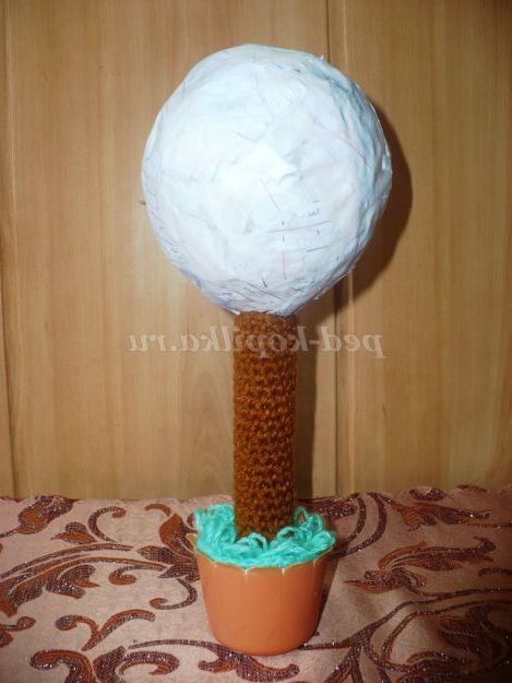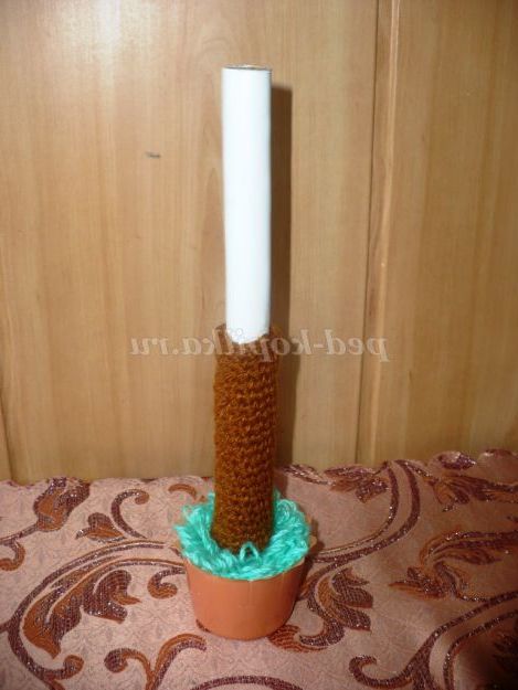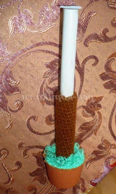 В'яжемо «кору» для стовбура. Для цього набираємо коричневою пряжею ланцюжок з повітряних петель дорівнює обхвату стовбура. Пров'язуємо ряд стовпчиками без накиду, замикаємо в коло і в'яжемо на висоту стовбура.
