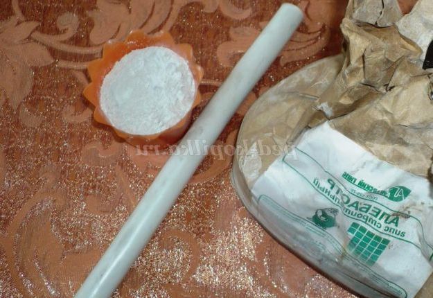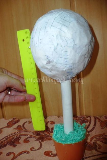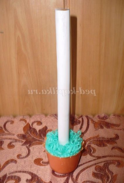 Насипте в горщик гіпс, залийте водою, розмішайте гіпс з водою до однорідної консистенції, вставити трубочку для стовбура в середину горщика і залиште до повного висихання.