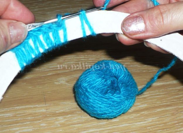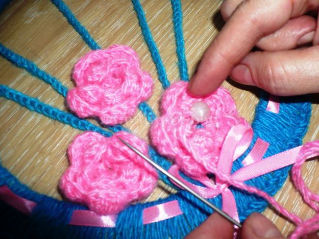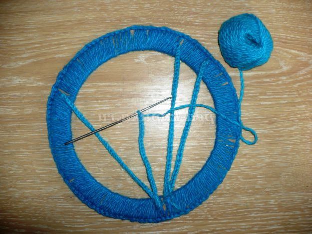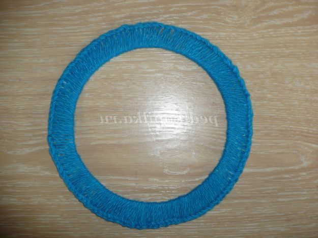 З задньої сторони внизу рамки гачком причепити нитка блакитного кольору і зв'язати ланцюжок з повітряних петель, потім причепити її вгорі рамки з заднього боку