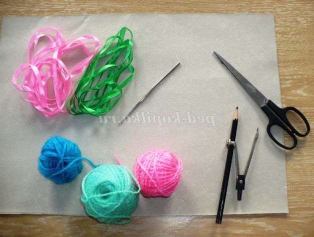 Для роботи знадобиться: щільний картон,пряжа блакитного,рожевого,зеленого кольорів,циркуль, ножиці,голка для пришивання,намистинки,простий олівець,гачок і атласні стрічки рожевого та зеленого кольорів