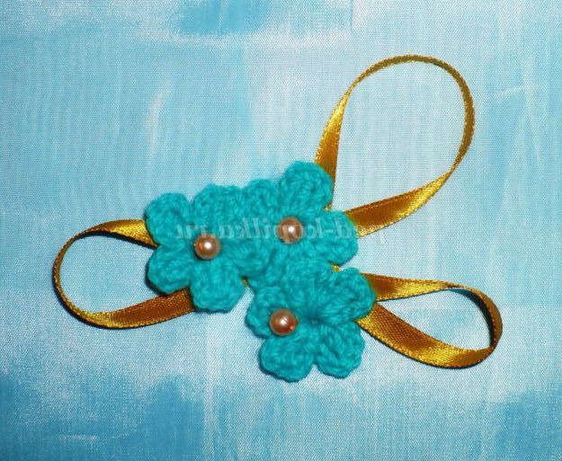 Прикрашаємо букетик незабудок атласною стрічкою. Для цього з задньої сторони букетика формуємо три листки з стрічки.