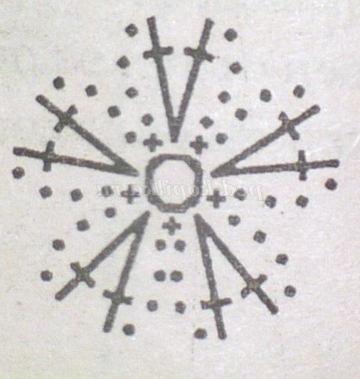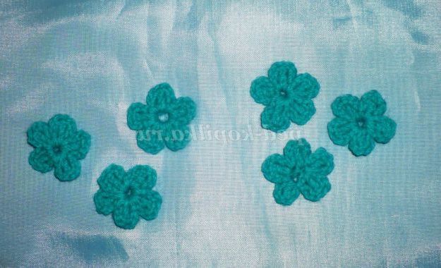 Для прикраси рамки в'яжемо за схемою 6 незабудок. Умовні позначення: точка-повітряна петля, плюс-стовпчик без накиду, хрестик-стовпчик з накидом. Нитка блакитного кольору оберніть навколо великого пальця кільце і вывяжите з отриманого кільця стовпчик без накиду, далі в'яжіть за схемою.