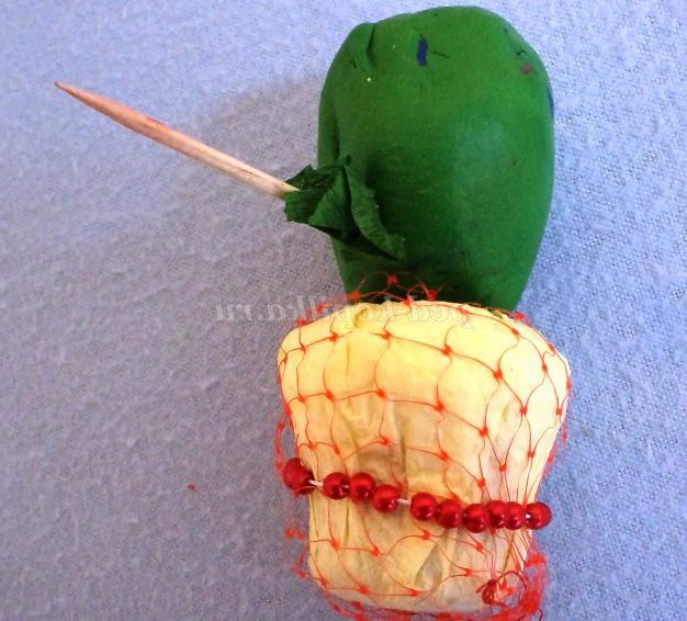 1.Необходимый матеріал: пластилін, крепований зелена папір, ножиці, серветка, зубочистки, прикраси (намистини, сітка, квітка)
