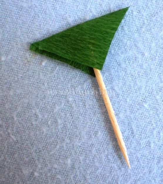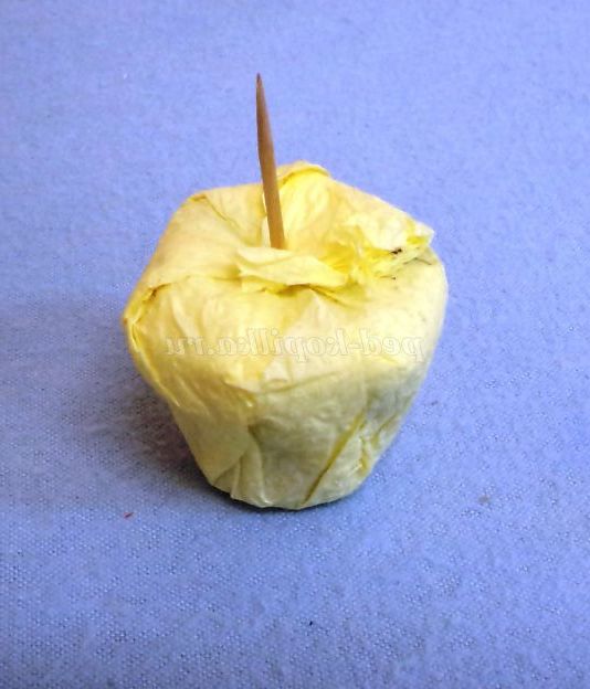 7.Обрезаем гострий край зубочистки, кладемо паличку в середину квадратика, закриваємо його куточок до куточка, сминаем папір навколо палички, покрутивши її між пальцями, щоб утворилася трубочка.