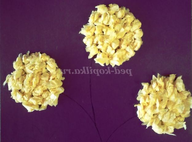 Аплікація. Кульбабки з паперових грудочок і крепованого паперу