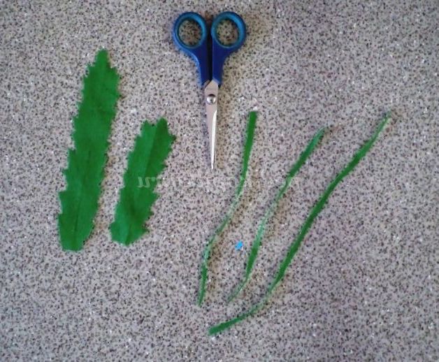 9. Вирізаємо з крепованого зеленої смужки паперу (стебла) і листя (2 - 3)