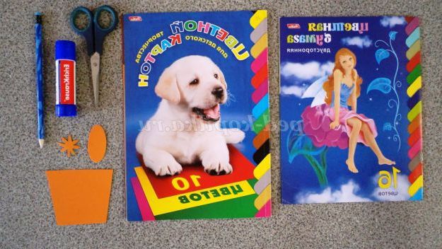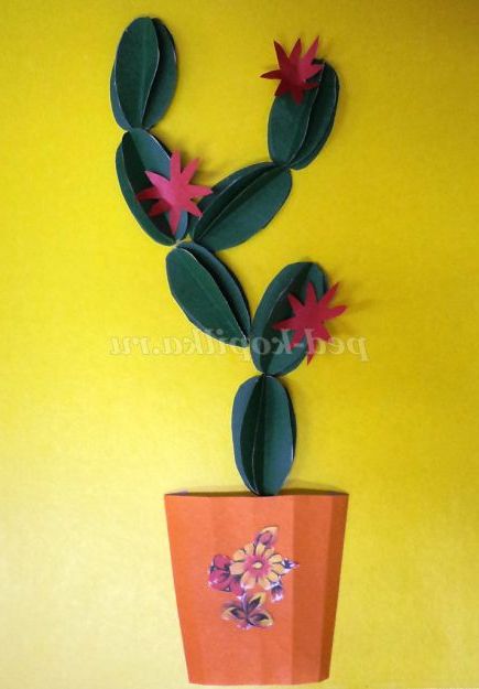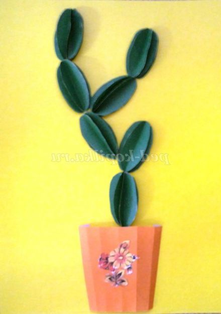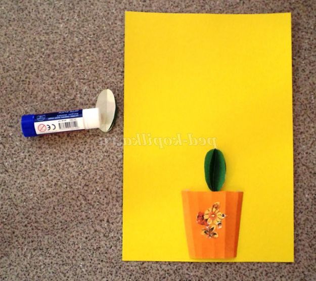 4.Намазываем клеєм крайні межі і приклеюємо на аркуш кольорового картону. Горщик можна прикрасити малюнками, наклейками і т. д.