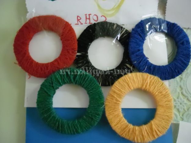 Так само я пробувала олімпійські кільця зробити з використанням кілець з картону та ниток для вязания.Я просто обмотала нитками кожне кільце.