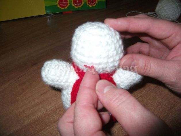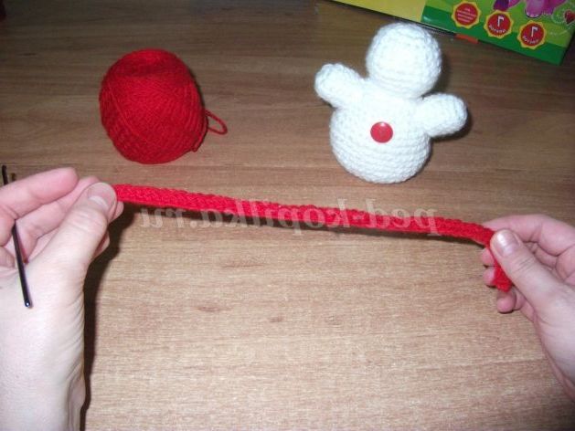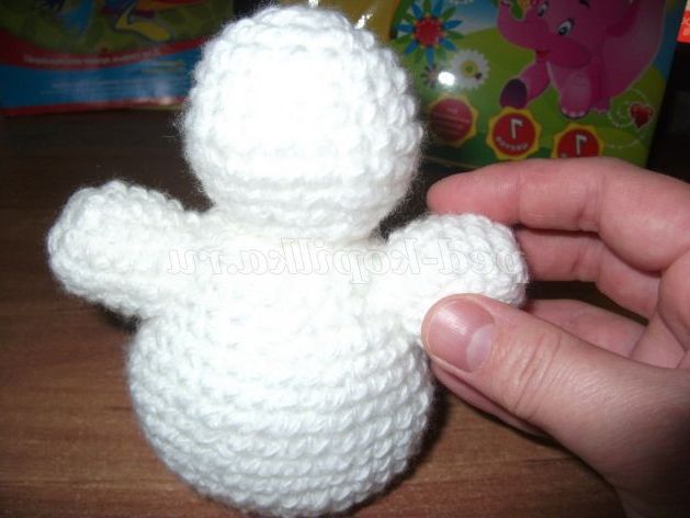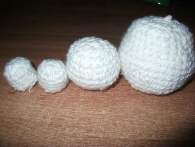 Сніговик пов'язаний з білих, акрилових ниток, стовпчиками без накиду. Складається з чотирьох кіл - кульок, різної величини. Кожен коло починаємо в'язати з набору чотирьох петель і замиканні їх в коло стовпчиком без накиду. У утворився коло в'яжемо вісім стовпчиків без накиду.