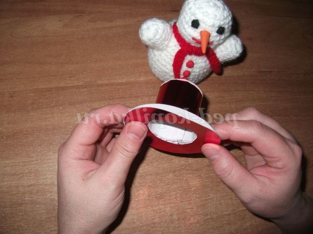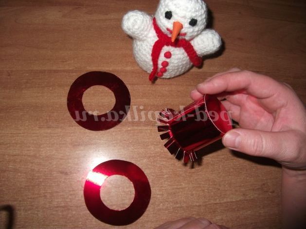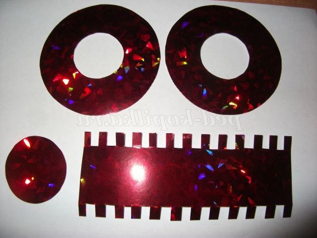Приступаємо до виготовлення капелюхи для нашого «Сніговика». Нам знадобиться голографічний картон червоного кольору. Вирізаємо з картону круг - дно капелюхи, діаметр - ; прямокутник довжиною 16 см, шириною - 6см, - циліндр капелюхи; два однакових по діаметру, великих кола , в середині попередньо вирізавши маленький коло - «поля» капелюхи.