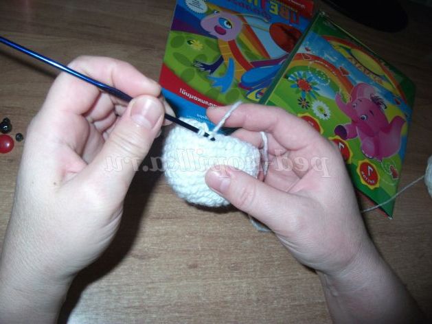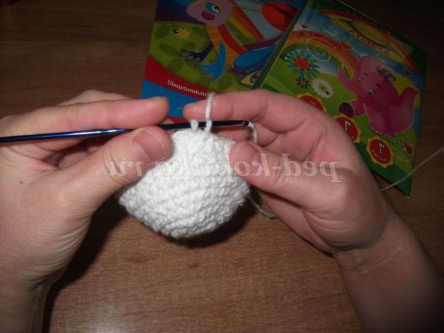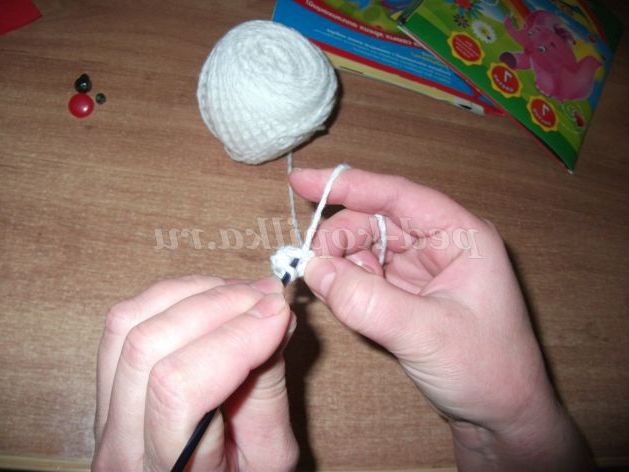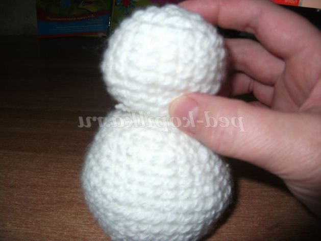 Аналогічно в'яжемо коло - кулька поменше - «голова» Сніговика. Лише розширюємо денце кола до шостого ряду, шляхом додавання петель: в першому ряду 1 стовпчик без накиду в першу петлю, 2 стовпчика без накиду (надбавку) - у другу петлю; у другому ряду надбавку робимо через дві петлі, а в третьому - через три петлі і так до шостого ряду, а потім починаємо закруглювати шляхом скорочення петель.