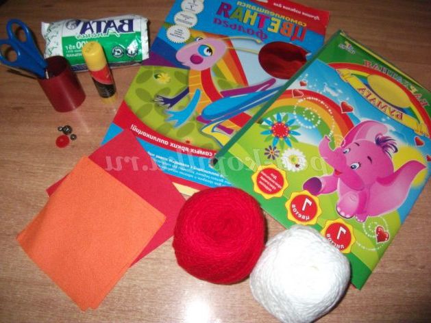 Матеріали: гачок, нитки «Акрил»: білого, червоного та чорного кольору; паперові серветки: червоного, оранжевого кольору; вата; кольоровий голографічний картон; ножиці, олівець, клей, нитка з голкою.