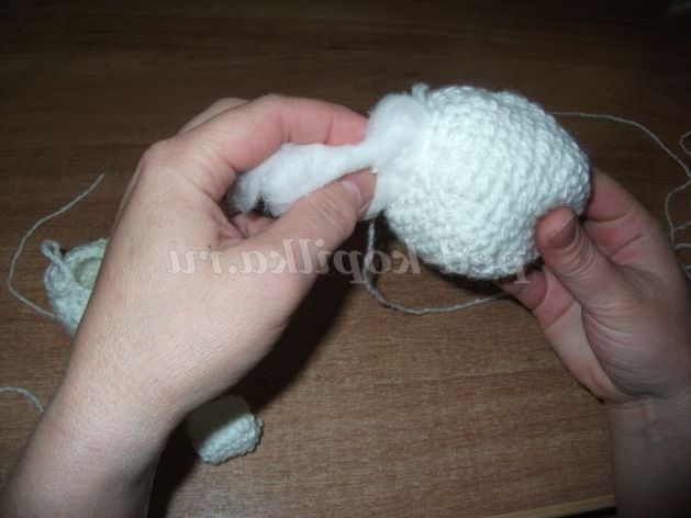 Беремо вату (можна взяти синтипон) і набиваємо всередину, продовжуємо поступово скорочувати петлі до отримання кульки.