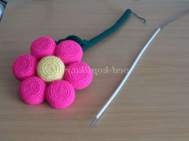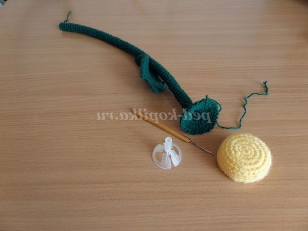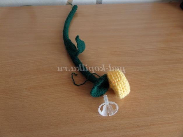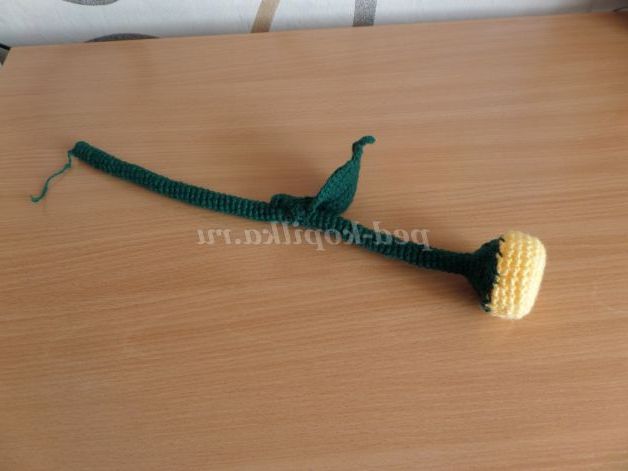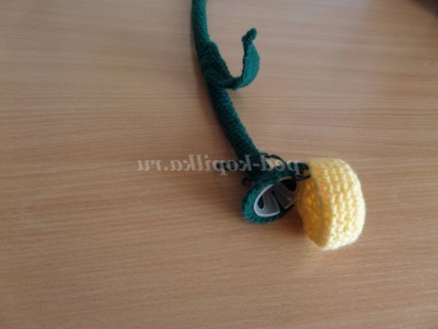 8. Провязав всю трубочку, на кінці її в'яжемо розширення під ковпачок-воронку і прив'язуємо листочок до стеблинки
