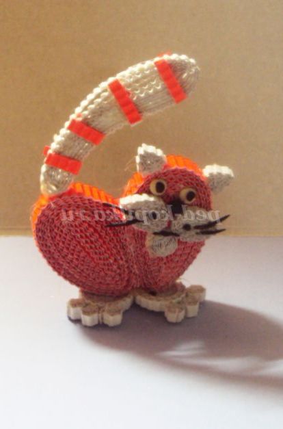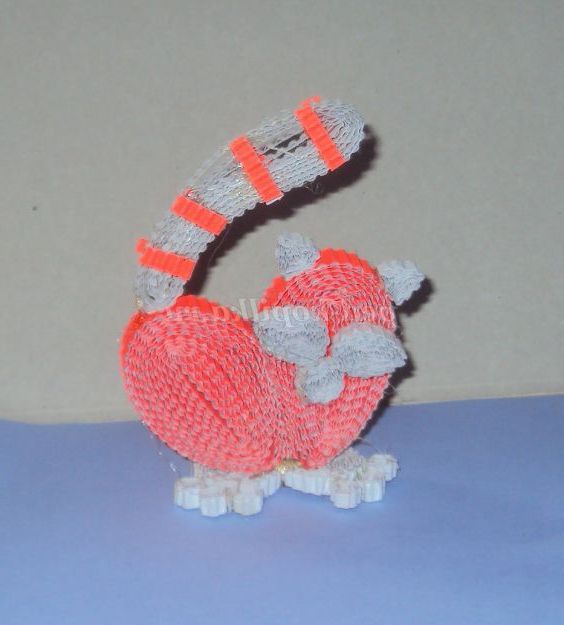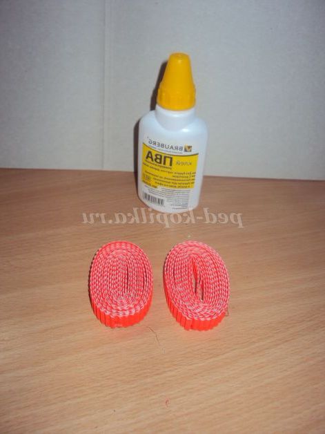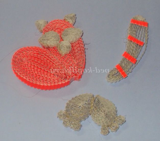 Хвіст виконуємо з решти смужок. Склеївши їх у стрічку, і відступивши від краю 15-20 горбків, скручуємо диск овальної форми, аналогічно половинки сердечка. Хвіст вийде «рихлим», що б зміцнити його і надати потрібну форму наклеїв червоні смужки.