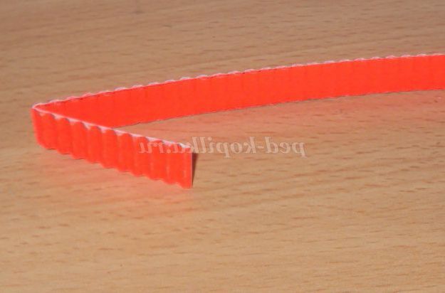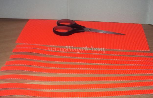 На першому етапі необхідно з картону червоного кольору в довжину нарізати 10 смужок шириною 1 см. Це заготовки на тулубі-сердечко.