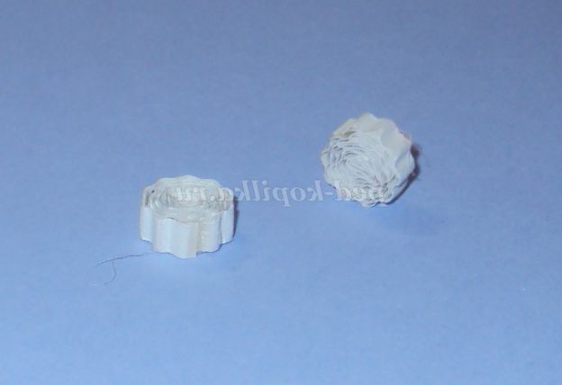 Першу смужку поділяємо на дві рівні частини і скручуємо з кожної половинки тугий диск.