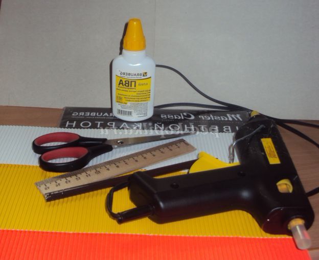 Матеріали та інструменти: Кольоровий гофрований картон, клей ПВА, клейовий пістолет і стрижні до нього, лінійка, олівець, ножиці.