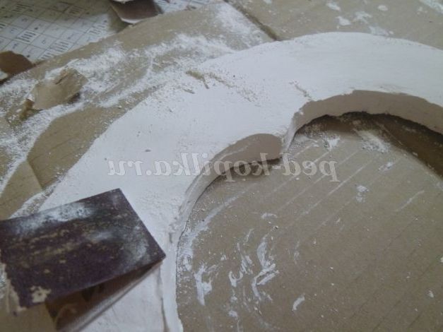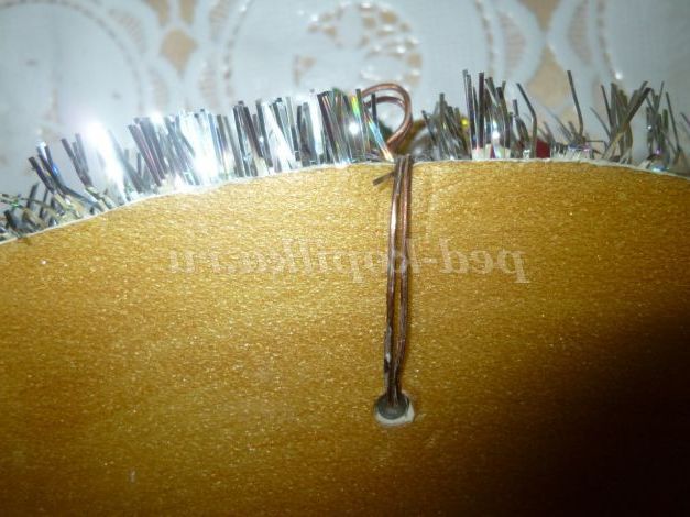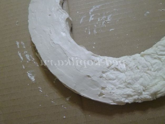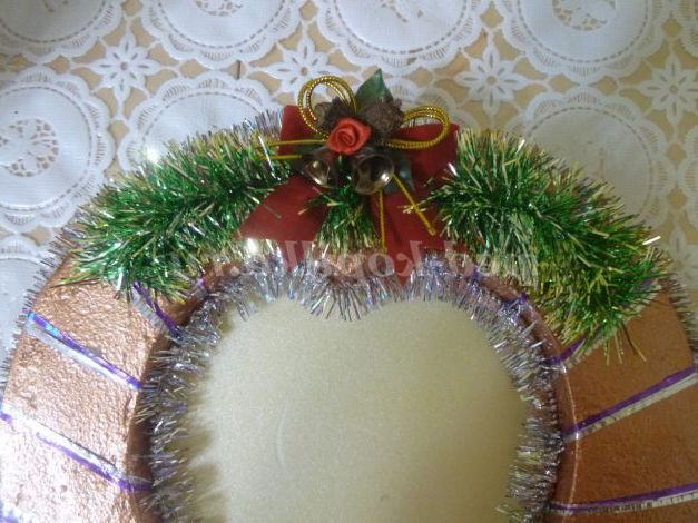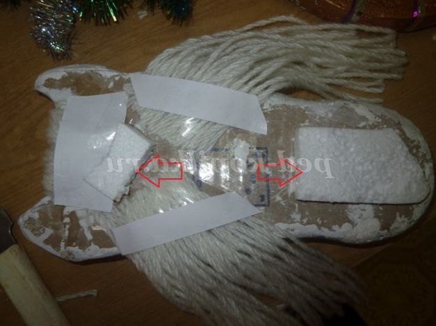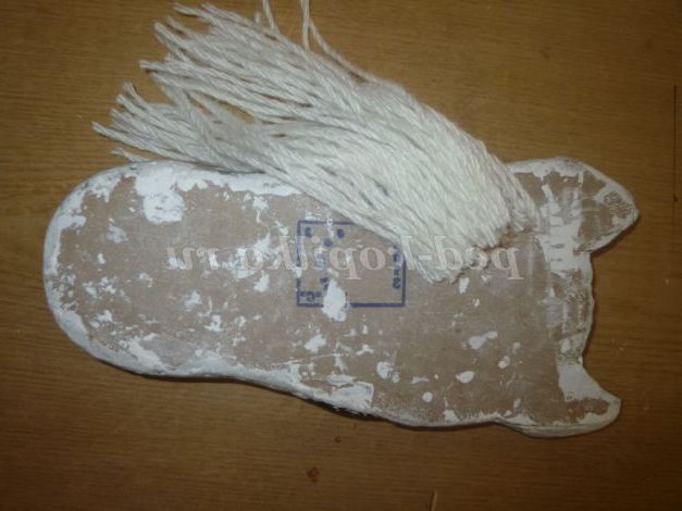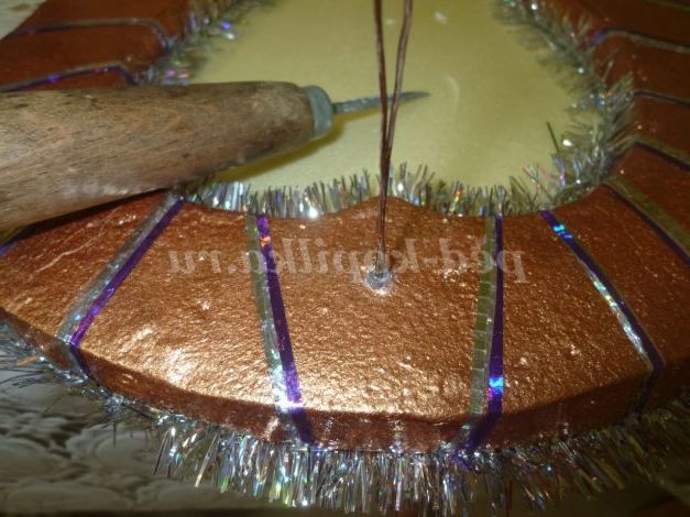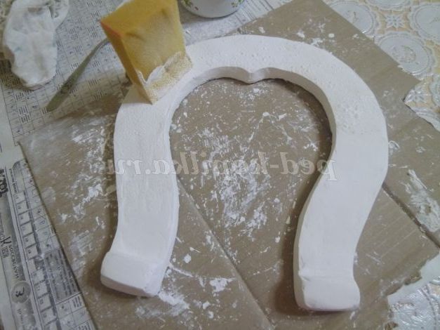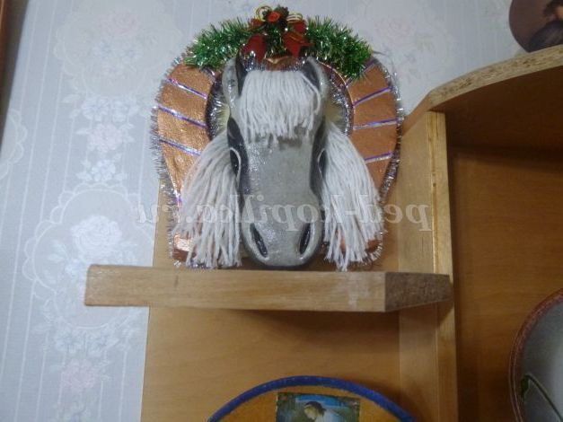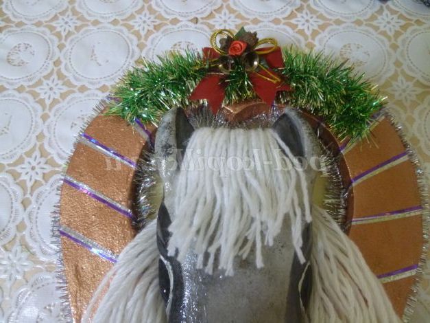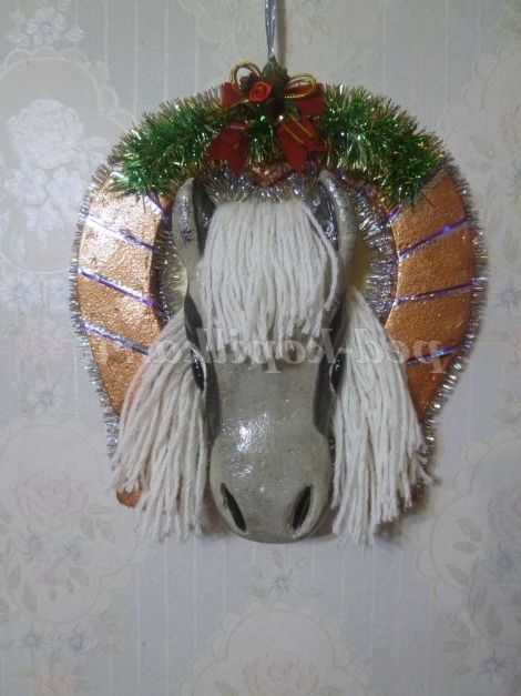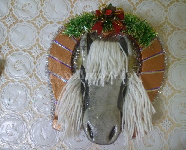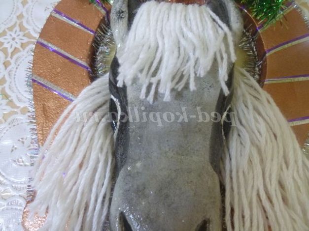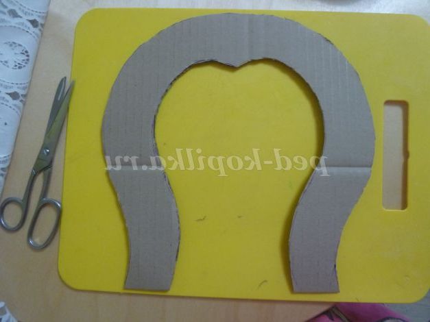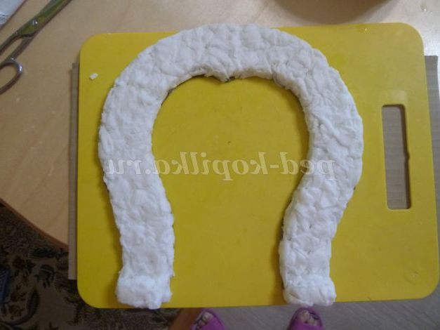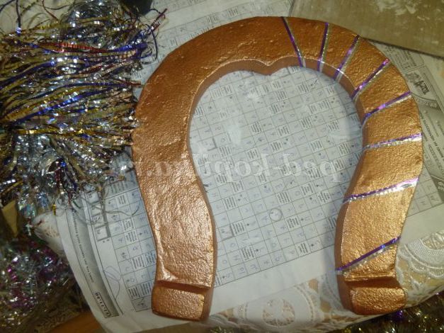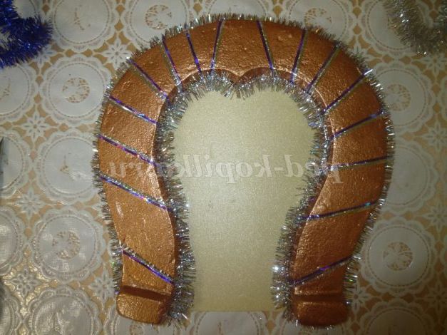 Для того, щоб виріб з зворотної сторони виглядала естетично і щоб прикріпити голову коня, вирізаємо з стельового пінопласту форму підкови (по зовнішньому краю). Заодно прикрашаємо по контуру дрібної мішурою, використовуючи клей «Титан».