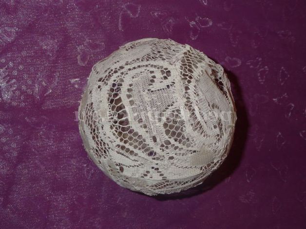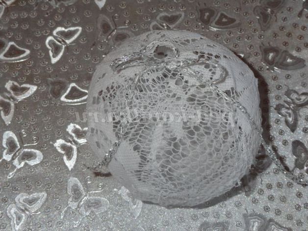 Навколо отвору, через яке ми витягли повітряна кулька, протягуємо срібну тасьму і формуємо бантик