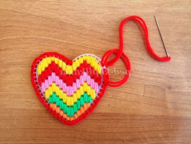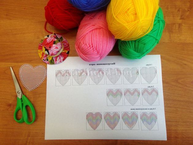 пластикові формочки "сердечко", пряжа "Крихітка" різних кольорів, ножиці, голка з широким вушком, інструкційні картки. Додаткові матеріали для оформлення зворотного боку виробу (фетр, мереживо ,тасьма)