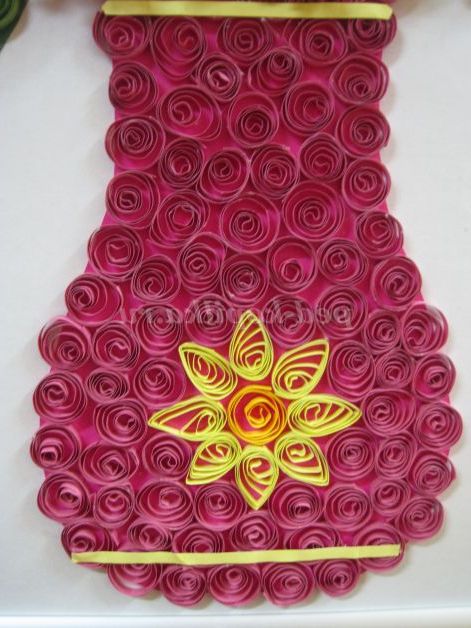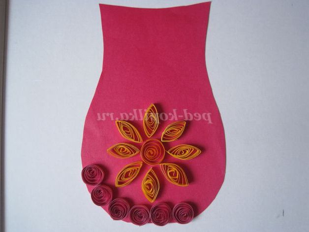 Квітка приклеюємо в середину вази і викладаємо вазу спіральками рожевого кольору, закрученими тим же способом, що і квітка.