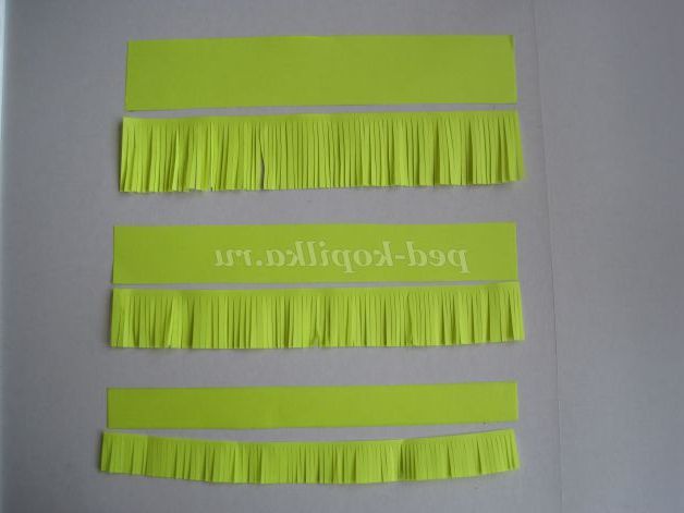 Смужки (4 см, 3 см, 2 см) з одного боку ріжемо соломкою, від краю залишаємо кілька міліметрів. Чим вже соломка, тим витонченіше квітка.