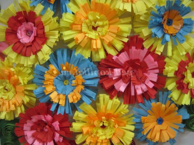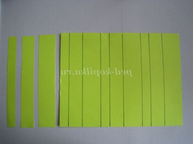Приступаємо до виготовлення квітів. Для цього беремо аркуш кольорового двостороннього паперу для ксерокса, расчерчиваем його на смужки розміром 4 см, 3 см, 2 см, 0,5 див. Лист розрізаємо на смужки. Також чинимо з аркушами паперу іншого кольору.