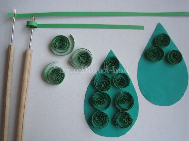 З смуг зеленого кольору шириною 0,5 см скручуємо спіральки і прикрашаємо листя.