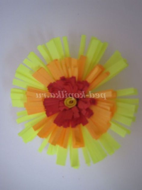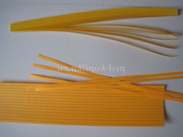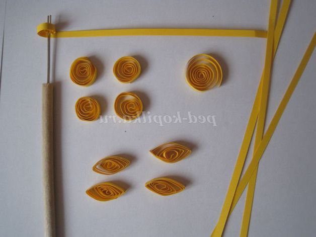Вазу викладаємо кружечками з скручені спіраллю смужок; прикрашаємо квіткою, виконаним способом квілінг, і двома горизонтальними смужками. Щоб зробити квітка, для прикраси вази, потрібно взяти дев'ять смужок для квілінгу жовтого кольору (смужки можна придбати в магазині "Товари для квілінгу" або нарізати самим з кольорового паперу для ксерокса - ширина смуг 0,5 см).