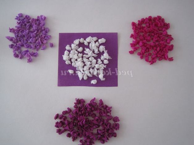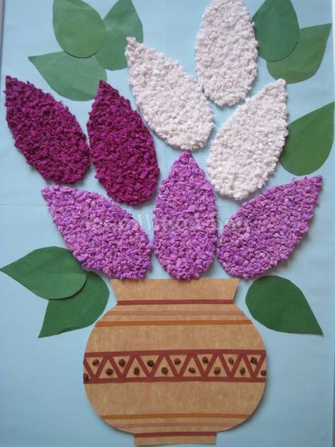 На основу приклеюємо папір для фону, наклеюємо вазу, приклеюємо бутони і листя бузку. Наше готове панно.