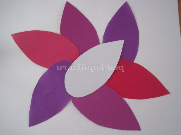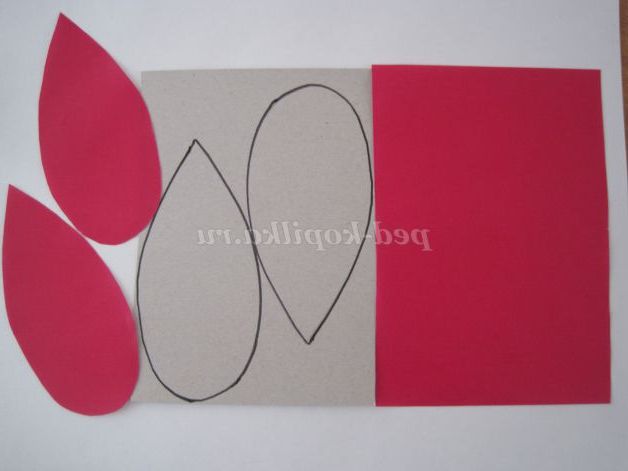 Беремо картон малинового кольору, обводимо шаблон і вирізаємо. Точно також вирізаємо основи для бутонів інших кольорів (фіалетового і білого)