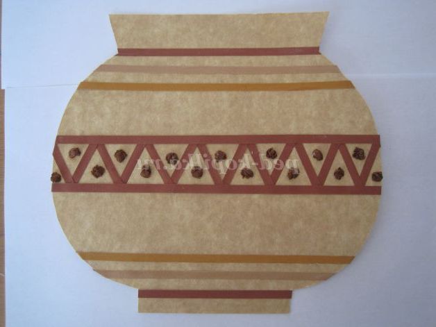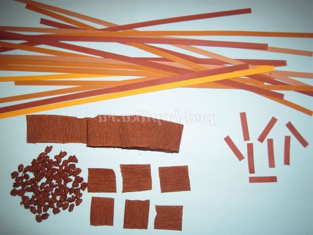 Для цього беремо смужки для квілінгу, розрізаємо на частини і наклеюємо на вазу. Виготовляємо грудочки з коричневої гофрованого паперу і прикрашаємо вазу.