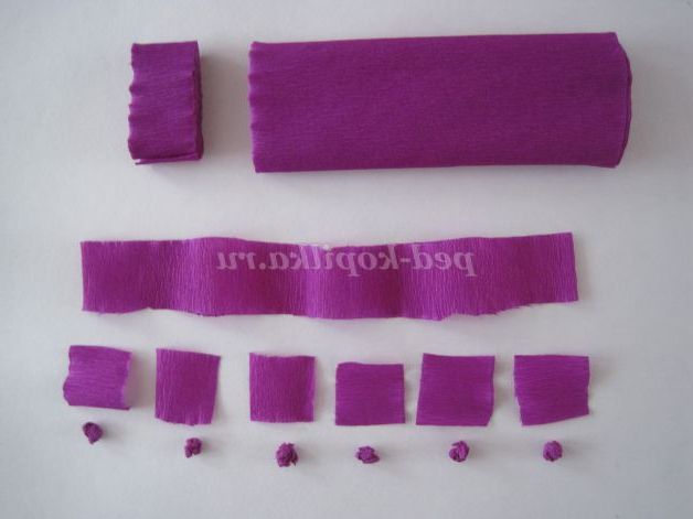 Тепер беремо гофровану (креповую) папір, відрізаємо смужку шириною 2 см, ріжемо смужку на квадрати розміром 2см х 2см. З квадратів, пальцями рук, катаємо кульки. Беремо гофровану папір іншого кольору, ріжемо на квадрати і катаємо кульки.
